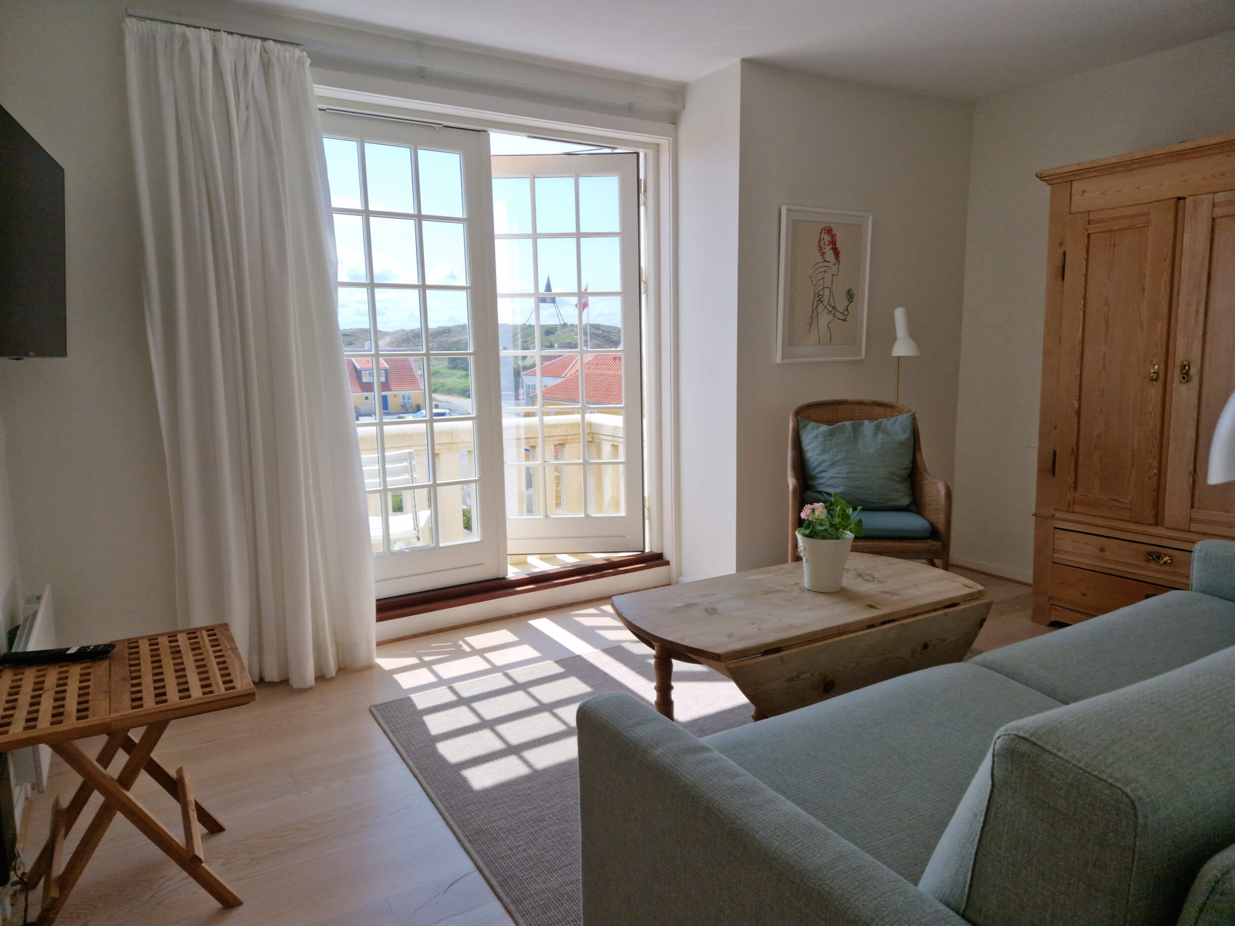 Mod syd, indrettet som opholdsstue med sovesofa, bad og franske døre ud til en stor altan.