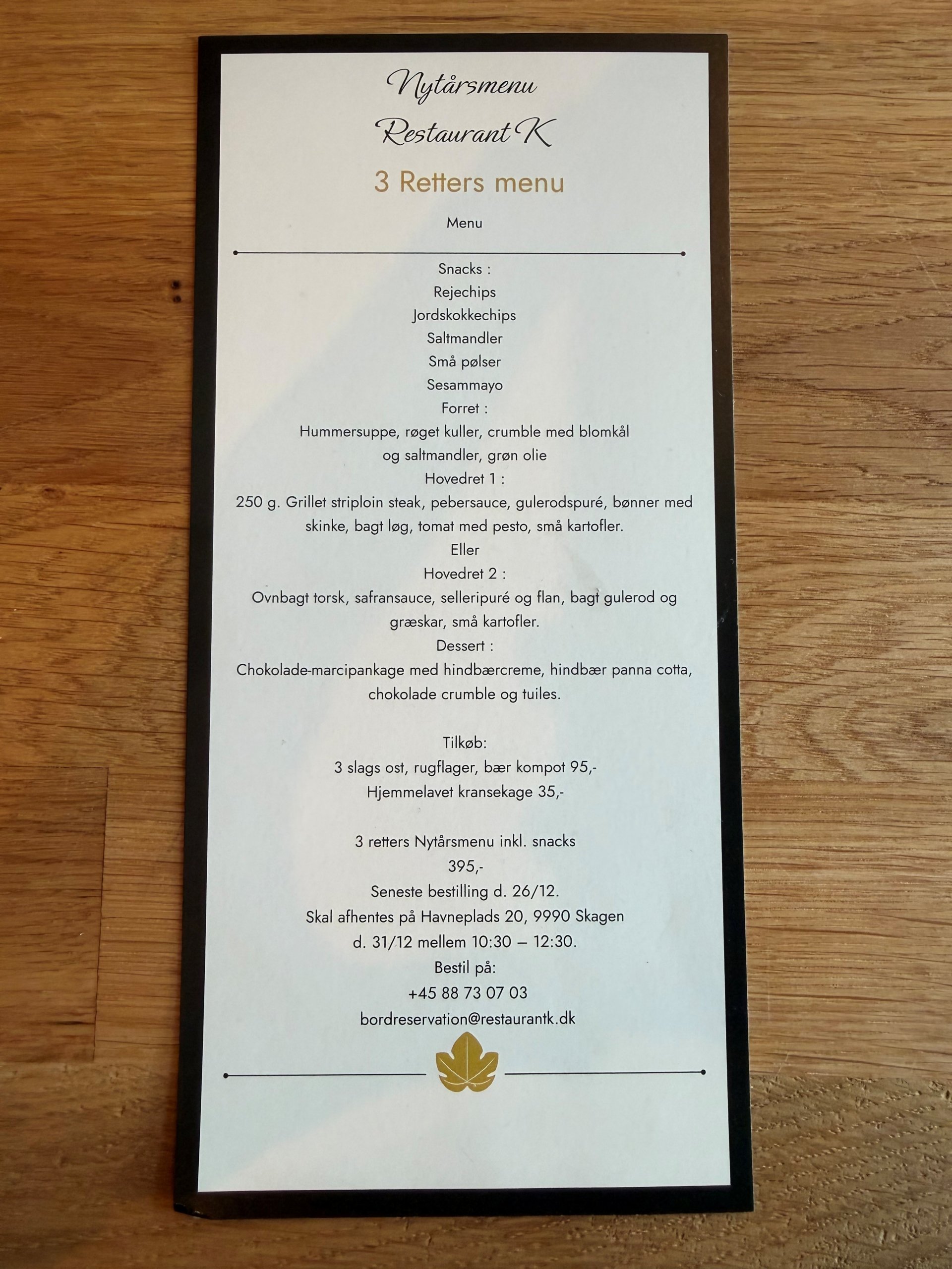 Skal I holde Nytår på Jeckels – tilbyder Restaurant K en lækker 3 retters Nytårsmenu for 395,- kr.